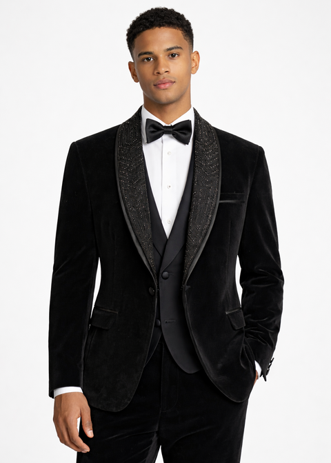 Slim Fit Black Velvet Embroidered Detachable Lapel Tuxedo